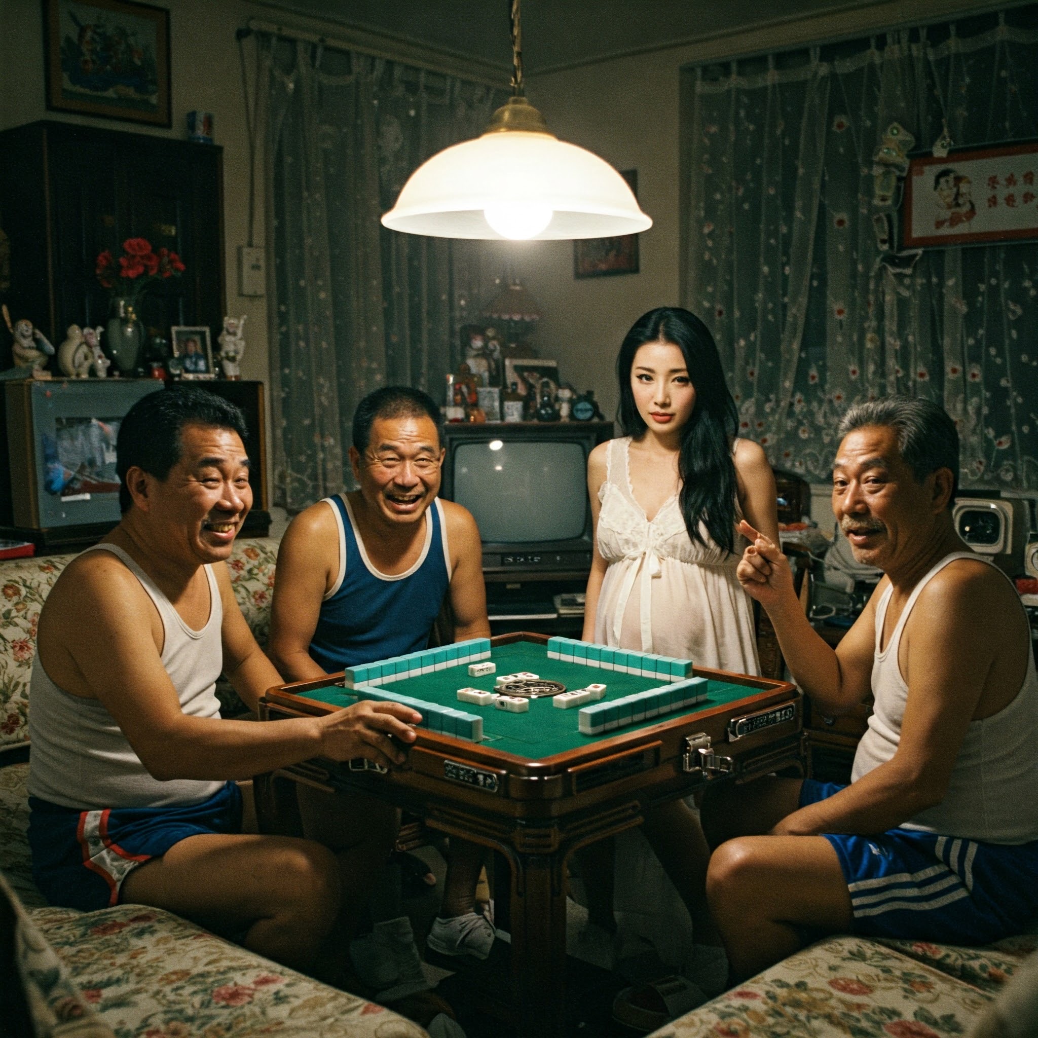 農村牌局露天擺,孕婦旁觀看打牌。可嘆老頭只管賭,錯過賤貨濕雞掰。
